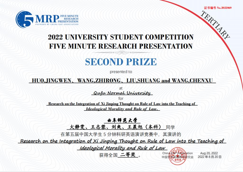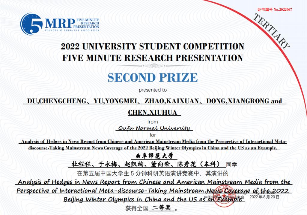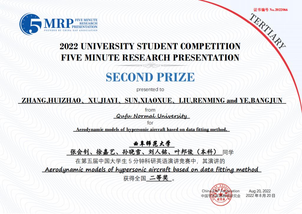 附2:第五届中国大学生五分钟科研英语演讲大赛华体会体育官方在线官网获奖团队获奖证书