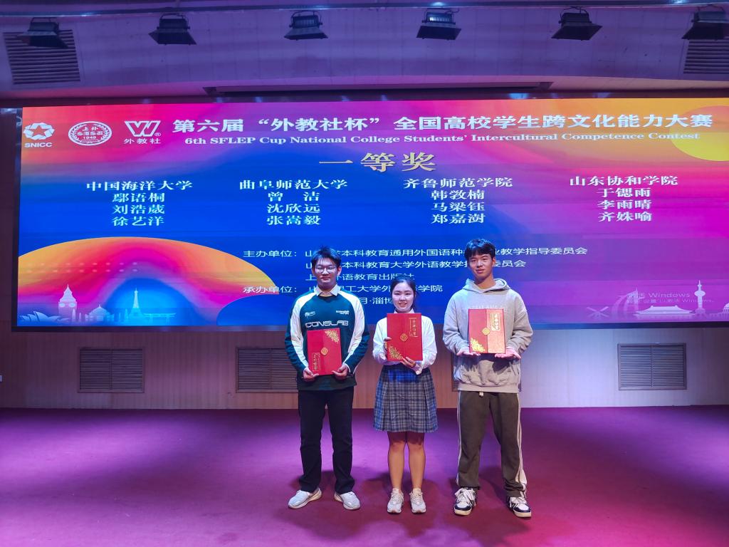 近日,第六届“外教社杯”全国高校学生跨文化能力大赛山东赛区比赛在山东理工大学落下帷幕,由华体会体育官方在线官网董伟老师指导,我校学子曾洁、沈欣远、张嵩毅组成的团队在复赛与决赛环节表现出众,荣获山东赛区选拔赛一等奖。
