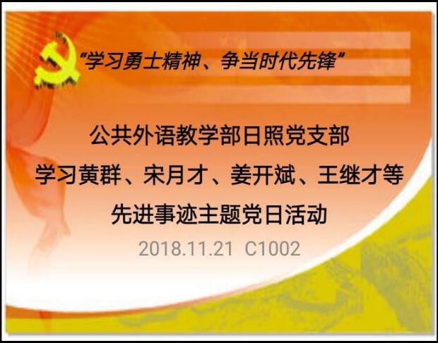 2018年11月21日下午3点,公共外语教学部日照党支部在C1002举行“学习勇士精神、争当时代先锋”——学习黄群、宋月才、姜开斌、王继才等先进事迹主题党日活动。会议由支部书记杜庆凤主持,全体党员以及党员发展对象参加。