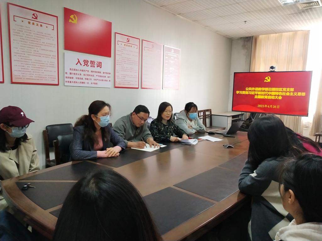 4月26日,公共外语教学部日照校区党支部在JC1002会议室召开学习贯彻习近平新时代中国特色社会主义思想主题教育启动大会,支部书记杜庆凤主持,全体党员参加。