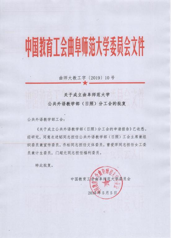 曲师大教工字〔2019〕10号关于成立华体会体育官方在线官网公共外语教学部(日照)分工会的批复