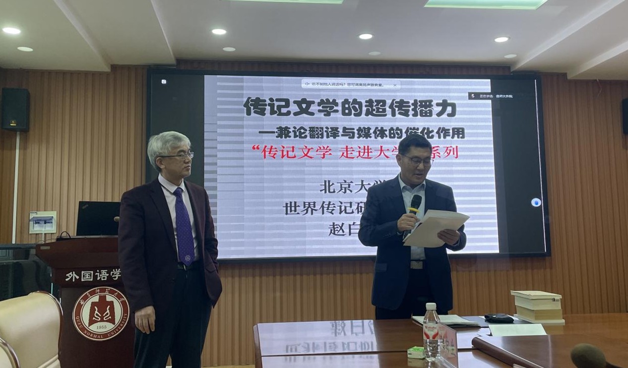 2025年11月5日下午,华体会体育官方在线官网70周年校庆系列学术活动暨公共外语教学部博雅讲坛第十场在外国语学院206会议室顺利举行。北京大学外语学院教授、博士生导师赵白生应邀作题为“传记文学的超传播力——兼论翻译与媒体的催化作用”的学术报告,公共外语教学部主任王福祥教授主持讲座,公共外语教学部及外国语学院部分师生参与活动。