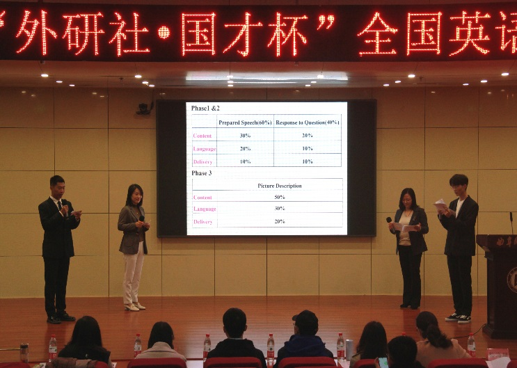 比赛共分为三个环节,第一轮定题演讲( “Red Star Over China”),第二轮为即兴演讲,第三轮图片描述。比赛过程精彩纷呈,高潮迭起。十二名选手准备充分,精神饱满,稳定发挥,展示出了良好的英语口语表达能力和机敏的应变能力。评委老师本着公平公正的原则,认真负责的态度,对选手们的表现做出评定。