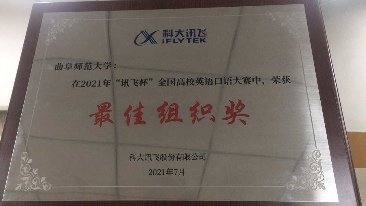 中国共产党成立100周年之际,为回顾党的奋斗历史,继承和发扬党的光荣传统,加强高校意识形态建设,丰富高校党建活动的形式,科大讯飞高教产品线特别策划主题赛事活动,以激发大学生的历史责任感、使命感和荣誉感,展示当代大学生有理想、有本领、有担当的精神风貌。在524-615日举办的2021年“讯飞杯”全国高校英语口语大赛山东赛事中,公共外语教学部积极筹备,发动学生参赛,取得了山东赛区比赛规模和参赛人数和获奖人数第一名的好成绩。本次大赛中,山东省口语大赛开通赛事权限高校51家,有比赛数据的43家,17000名同学参与,约9000人完成赛事,我校921名同学参加,89名同学获奖,其中特等奖1名、一等奖1名、二等奖4名、三等奖17名,优秀奖41名,相应教师获得“优秀指导教师”奖。华体会体育官方在线官网公共外语教学部获得“最佳组织奖”称号。