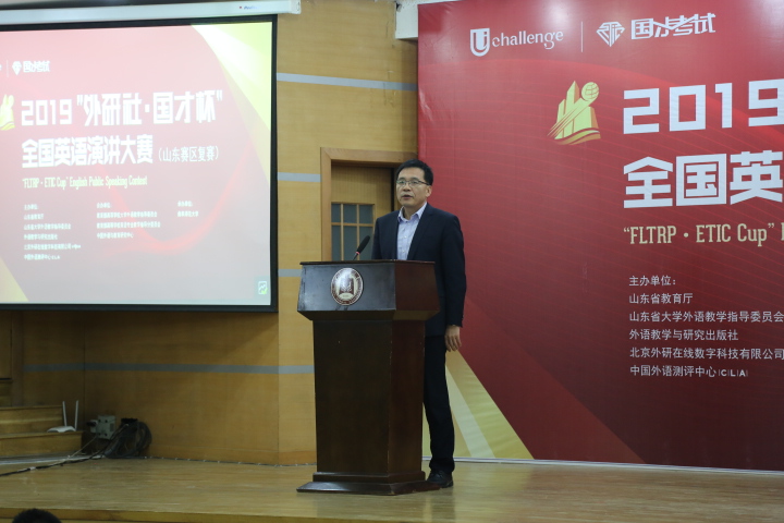 山东省大学外语教学指导委员会主任委员、华体会体育官方在线官网公共外语教学部主任王广成教授在致辞中指出:“Uchallenge大学生英语挑战赛”系列,是由山东省教育厅、外语教学与研究出版社等单位联合主办的一项公益赛事,“大赛以高远的立意和创新的理念,顺应时代发展大势,聚焦国家时事热点。大赛既是当代大学生展现风采、实现自我的舞台,也是外语教育领域凝聚创新、融通中外的交流媒介。”是唯一纳入“中国高校创新人才培养暨学科竞赛评估项目”的英语竞赛。希望参赛同学在比赛中能够收获赛场经历,学习优秀选手身上的亮点;领悟语言表达魅力,目睹思想碰撞火花;在高手云集的舞台上展现自我、提高自我。作为此次比赛的具体承办者,一定本着公平、公正、公开的原则组织赛事,认认真真、尽心尽力地为大家做好服务。
